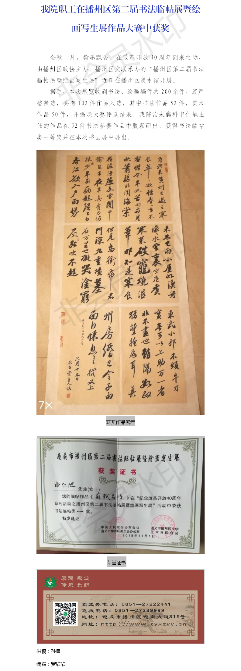 我院职工在播州区第二届书法临帖展暨绘画写生展作品大赛中获奖