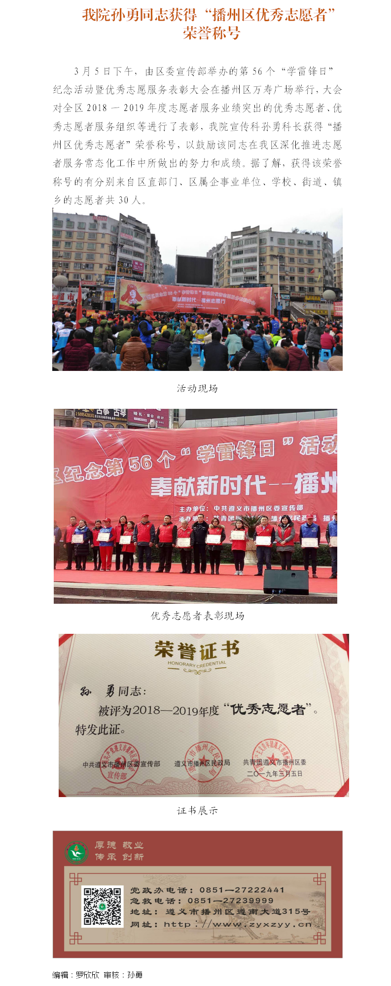 我院孙勇同志获得“播州区优秀志愿者”荣誉称号